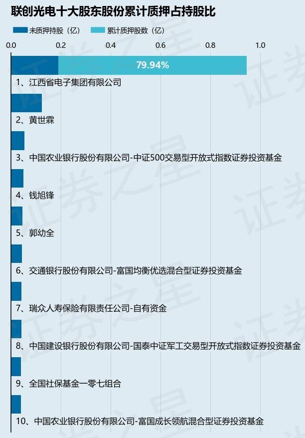 截止本公告日,股东江西省电子集团有限公司已累计质押股份7573.28万股,占其持股总数的79.94%。本次质押后联创光电十大股东的累计质押股份占持股比例(占持股比例的计算以公司最新一期财务报表公布的十大股东的持股总数为基准)见下图: