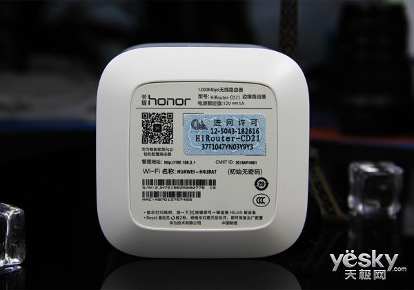 荣耀路由2S的底部设计简洁,但内容却相对丰富,即有产品铭牌同时还设定了路由器的wifi初始名称和管理地址,想要更进一步加强路由器的使用功能,设定了智能家居App的二维码。