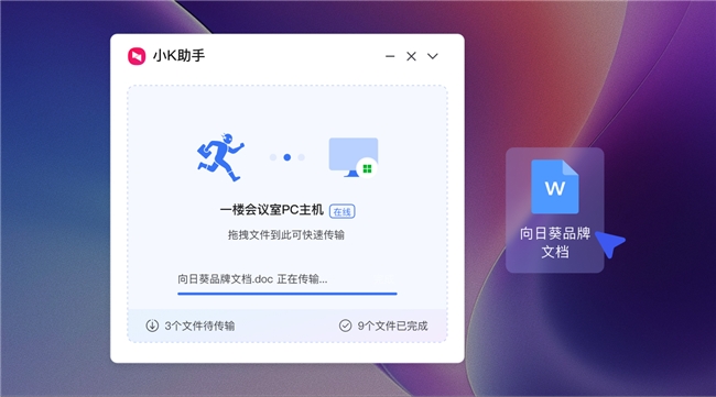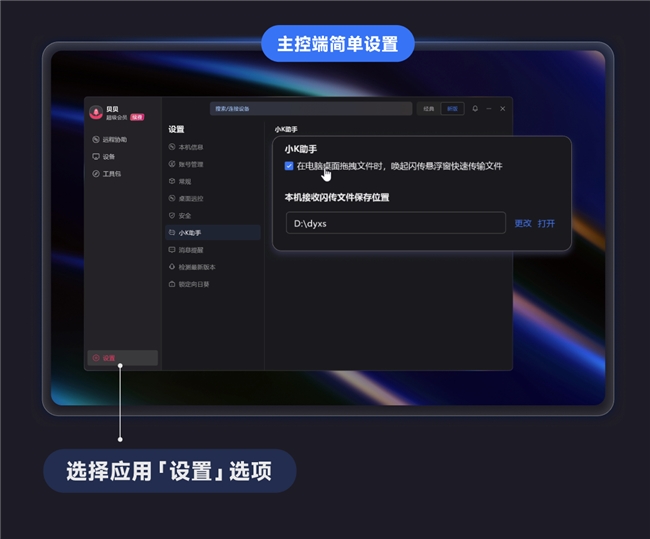 如何使用闪传文件呢?我们首先在【设置→小K】中开启“闪传悬浮窗”功能;之后在主控端选择目标设备;开启功能后,直接将文件拖入悬浮窗,一放即传,瞬间完成。用户体验如同在同一台设备中操作,大幅提升远控场景下的传输效率。