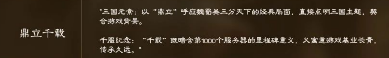 在先前的“千服名称共创活动”中,数千名热情的主公们积极响应,挥洒创意,最终票选出了一个气势磅礴的全新主题服名字——鼎立千载!玩家们在三谋中可以享受真正霸业永存的持久体验!