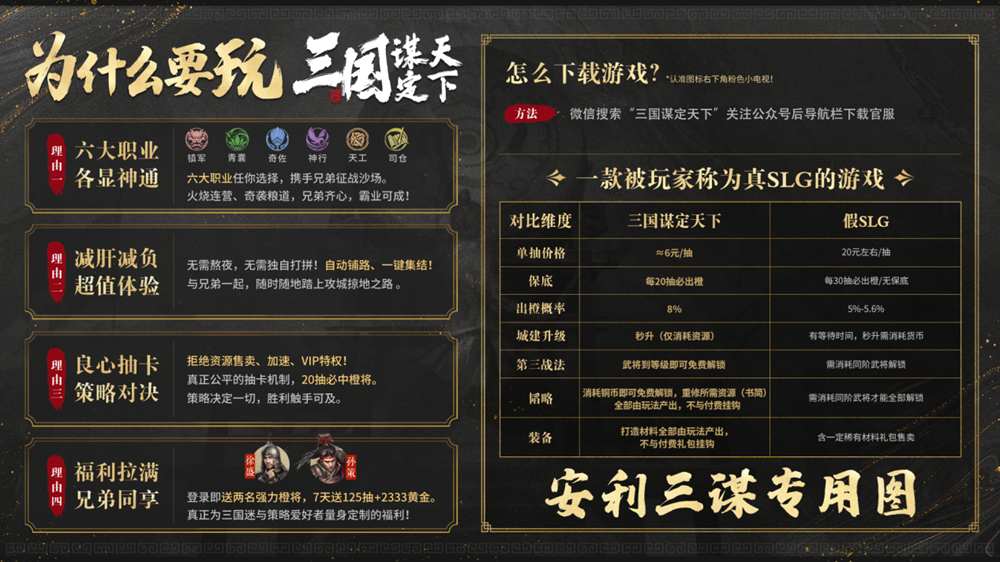 这可不是其他SLG游戏标榜的所谓“不氪金”青春服所能比拟的。那些游戏,实际上不仅做不到真正的“不氪金”,每个赛季还要无情地删档重启,让玩家们呕心沥血建立的基业、倾注热情培养的角色,都付诸东流。三谋为各位主公提供的一个稳定、长久的策略舞台,让大家可以尽情挥洒才智,书写属于自己的不朽传奇!